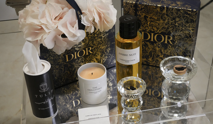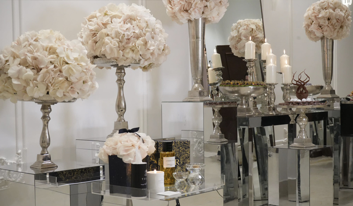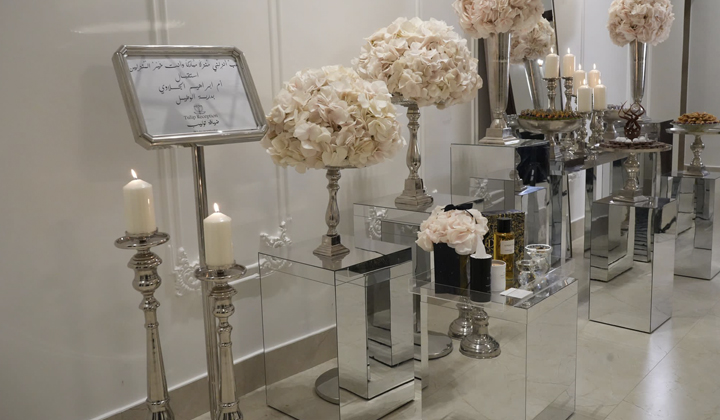 - طاولات مرايا يتم تنسيقها بالورد الصناعي.