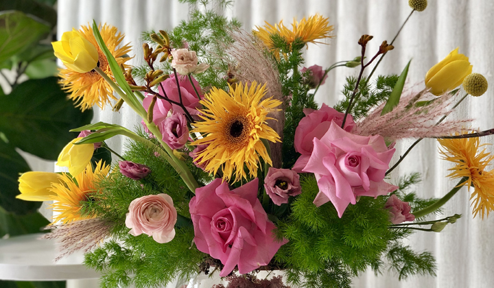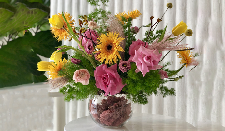 - وعاء منمق من الزهور الجافة والزهور النضرة في مزهرية .
